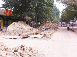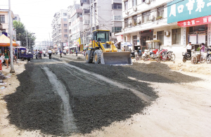 在路边开店的耿先生正坐在椅子上目不转睛地看着工人们铺设路基。自4月份此路段开工以来,耿先生的生意一直不是很好,但耿先生说:“这条路已损坏几年,每逢阴雨天气,路上就污水横流,附近居民一直盼着政府早日整修。尽管两个多月以来,我的生意有些损失,但看到路很快就要修好,我心里别提多高兴了。”