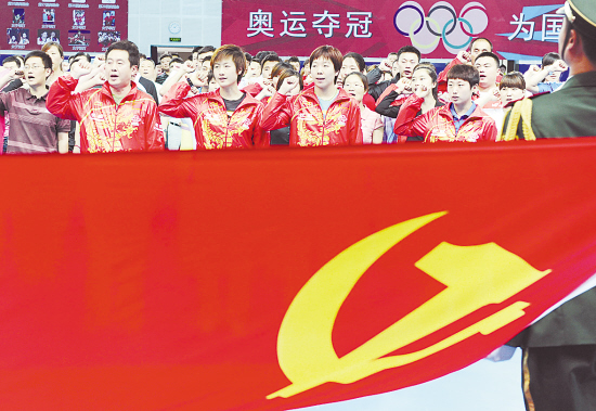 6月27日,伦敦奥运会国家女子乒乓球队新党员(前排左起)施之皓、丁宁、李晓霞和郭跃入党宣誓。当日,正在备战伦敦奥运会的国家乒乓球队新党员李晓霞、丁宁、郭跃、施之皓和四川省运动队新党员在位于成都的国家乒乓球队训练馆入党宣誓。 新华社记者江宏景摄