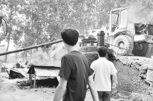 6月21日,由太康县环保局牵头,太康县逊母口镇政府、县电业局、县公安局、县广电局共同参与,一举捣毁了当地9家非法炼油企业。据悉,此次集中执法行动,共出动执法人员76名、执法车12辆、铲车1辆、挖机1台、拖车1辆,对9家非法炼油企业的生产线进行了强制性拆除,彻底摧毁了其炼油生产能力。图为执法现场。