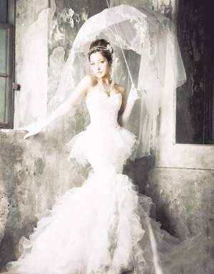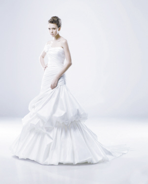鱼尾款式是婚纱的基本廓形之一,婚纱是服装中最华丽的设计。众多设计中鱼尾婚纱最别具一格,相比蓬松的公主型婚纱,它对身材的要求更严格,所以穿着鱼尾婚纱的人对自己的身材都有自信。但今季的鱼尾设计不再强调起伏的曲线,而把下摆位置提高,显得更为优雅纤瘦。