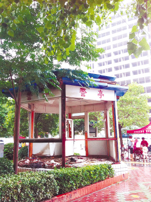这座警亭立于人行道旁。记者在现场看到,悬挂有“警亭”字样的亭子的玻璃窗已被拆卸一空,6面墙也被人拆得只剩下3面,亭里除了铺在地上的一条破草席外,四周布满垃圾和秽物。从亭边走过,行人不时可闻到一股令人作呕的臭味。