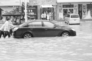 昨日下午,西华县突降暴雨,大雨导致县城多处路段出现积水。目前,该县相关部门已采取措施,排除路面积水。图为人民路东段车辆被困。