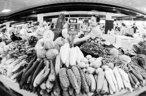 7月9日,浙江杭州万寿亭农贸市场的一名蔬菜摊主在等待顾客。