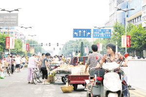 本报讯 周口市区八一大道与交通大道交叉口附近的八一农贸市场曾是周口市区20万市民的“菜篮子”,由于交易需求,该市场每日凌晨4时许至早上7时,临时占用南北走向的八一大道西侧车道、东西走向的交通大道南侧车道作为交易场所。这样一来,既不耽误菜市交易,又不影响正常交通通行。但目前,交易结束的时间越来越迟,甚至推迟到早上8时。7月9日早上7时40分,记者接到市区出租车司机和市民反映赶到现场看到,从八一大道与交通大道交叉口向南,八一大道西半部快车道100米长范围全部被占用,向南行驶的车辆无奈逆向行驶,存在严重安全隐患;从路口向西,交通大道南侧边道也是人山人海,自行车、电动车、三轮车,甚至行人都挤入交通大道快车道与汽车抢道,也很危险。