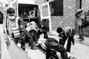 7月12日,在巴基斯坦东部城市拉合尔,救援人员在袭击现场搬运遇害警察尸体。