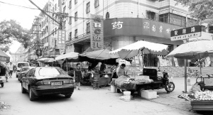昨日上午11时20分,记者在安居路看到,一些小商小贩把摊位设在路两边,道路只剩下2米左右的宽度,再加上一些市民前来买菜,这里显得拥挤不堪(如图一)。