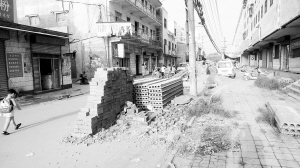 记者在颍河小区大门口东侧看到,居民建房用的沙子、砖头和水泥板等建筑材料随便堆放在路上,车辆难以通行(如图二)。