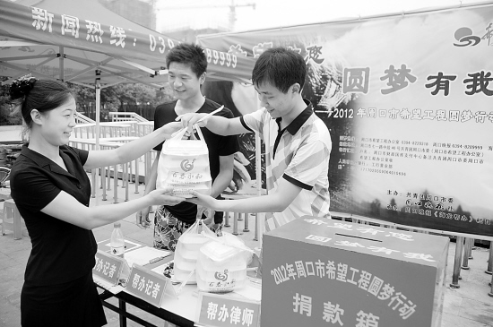 本报《海龙帮办》每周五上午在五一广场接待市民来访和报料几个月来,受到社会各界的广泛关注。7月15日中午,周口百春永和豆浆一店的工作人员为帮办记者送来了饭菜和西瓜。“永和豆浆”相关负责人说:“我们看到报道后很感动,你们是在做好事,我们也想奉献自己的爱心,为你们送来饭菜是希望你们能帮更多的市民。”(本报记者 摄)