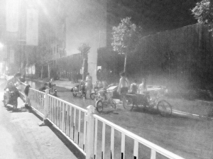 7月15日晚21时许,市区文昌大道一处施工工地排出的水漫到人行道上,夏夜外出乘凉的市民纷纷“借光”,把电动车、自行车停在水中洗刷起来。晚报记者 张洪涛 摄