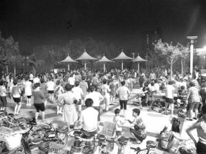 老两口一见到新建的滨河公园就喜欢上了。从此以后,他们到滨河公园跟“上下班”似的,每天早上都到滨河公园锻炼身体,吃过晚饭后,也要去滨河公园小广场上跟别的老年人聊聊天、跳跳舞(如图)。有时,老两口还带上孙子,一起享受天伦之乐。
