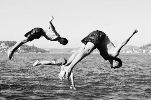7月16日,在土耳其的伊斯坦布尔,市民跳入博斯普鲁斯海峡戏水降温。