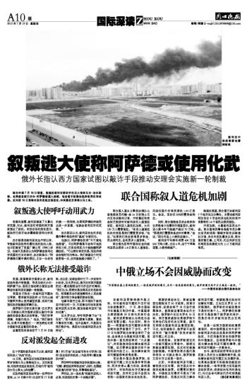 有消息称,在俄罗斯提交的一份叙问题决议草案中,俄提议联叙监督团延期,但反对对叙施加新制裁。中国常驻联合国代表李保东16日就此表示,俄罗斯案文同中方立场是一致的。