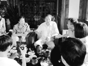 7月16日,茅于轼(中)与竞拍成功者在成都锦里品茶论道。