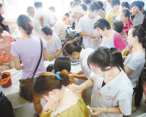 冬病夏治疗法,是我国医学独特的一种治疗、养生、保健方法,融汇了中医学、时间医学、顺势医学、免疫学等诸多学科知识。夏季,自然界阳旺阳升,相应的人体阳气有随着升旺的趋势,体内的凝寒之气也因此易解易除。因此,在阳气最旺的三伏天(头伏、中伏、末伏)通过药物敷贴手段达到调节人体功能、增强抵抗能力的三伏贴成为人们冬病夏治的有效治疗方法。7月18日是头伏,这一天热爱中医养生保健的人们纷纷赶往医院进行冬病的治疗与身体保健。据周口市中医院康复科的龚广峰介绍,这几年,到该院进行冬病夏治的人群成倍增长,7月18日到该科进行治疗的人数超过了千人。图为冬病夏治现场。
