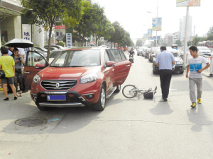本报讯 7月21日16时许,市交警支队事故科民警接到指令,交通大道与汉阳路交叉口东某洗浴中心门前发生一起交通事故:一辆轿车停在路边,乘客下车开车门时,骑自行的人撞到车门上摔倒在地。