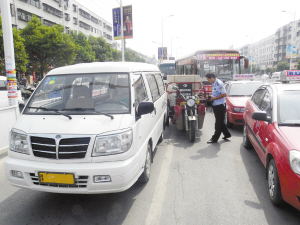 本报讯 7月21日9时许,周口市区常青路与交通大道交叉口处发生一起交通事故,一辆三轮摩托车追尾商务车,事故造成商务车轻微损伤(如图)。民警提醒市民,行车时注意保持车距。