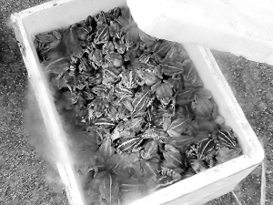车厢打开后,民警发现车上装有百余个泡沫箱,打开泡沫箱后,民警发现里面竟是活蹦乱跳的青蛙(如图),每箱足足有200余只。