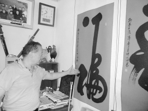 当日上午,记者辗转几个小胡同,走进了一座飘着淡淡墨香的不大的院子。走进屋内,四周墙壁上悬挂着的“福”“剑”等各种榜书作品让记者目不暇接,客厅内,一张长案被放置在显眼位置,一支支如椽大笔悬挂一边,而另一房间,堆满了老人创作用的足有一人多高的各种纸张,屋内还晾晒着一些刚创作好、墨迹仍未干透的作品……