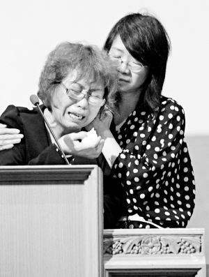 7月21日,遇害中国留学生林俊的母亲(左)在加拿大蒙特利尔举行的追悼会上痛哭失声。