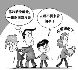 7月18日晚,魏先生带着家人在散步时见一男子抢劫女子的包,魏先生将男子制服。不料,被抢女子连声“谢谢”也没说,拿起包转身就走。目睹这一切的12岁的儿子拉着爸爸的衣角说:“以后不要多管闲事了”。
