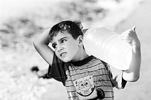 7月22日,叙利亚与土耳其接壤地区,一名难民儿童扛着一桶水。目前,叙利亚大量难民陷入缺粮缺水的困境。