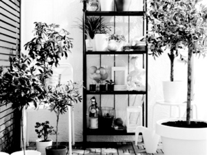 打造植物乐园,从芬芳中汲取清凉因子,也是快速清凉的不错选择。花架上每层摆放的植物种类不同,绿植茵茵,兰花淡雅,甜橙芬芳。香薰精油的芬芳也有舒缓情绪、释放压力的功效。案例中阳台面积不大,但是在植物选择上大小结合,搭配不同品类,上层、角落的空间充分利用但不拥挤,留出写意空间。