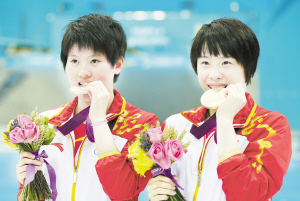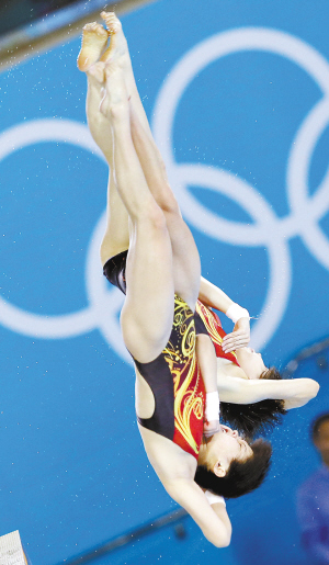 北京时间7月31日晚,在伦敦奥运会女子双人10米台跳水决赛中,中国组合陈若琳/汪皓以368.40分的总成绩夺冠。两位20岁小将为中国代表团夺得了本届奥运会的第十枚金牌,这也是中国跳水队收获的第三金。新华社 摄