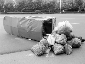 本报讯 8月5日11时30分许,记者在周口市区太昊中路紫荆城小区附近看到,一辆装有红色遮阳篷的电动三轮车侧翻在路边,车里的水果和蔬菜洒落一地(如右图),所幸无人员伤亡。车主张师傅一边捡地上散落的水果一边说:“天太热了,想早点回家,开得有点快,上‘台阶’时一不留神车就倒了。”