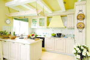 大操作台、整洁明亮的整体橱柜、颇具情趣的厨具器皿还有田园风格十足的花卉和装饰物,把这个厨房打造得就像是香草奶油冰淇淋,全面满足主人孩子般对美味的追求与贪婪。