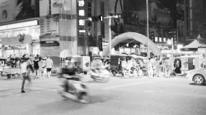 8月5日,记者17时30分来到该路口,看到交通秩序井然,没有三轮车聚集的现象(如图一)。但交警18时30分下班后,营运三轮车开始在这里聚集,此处通行随之变得拥堵(如图二)。私家车车主李先生说:“每天19时30分以后,三轮车把这里的双直行道堵成了单直行道,平时一个绿灯就能过去的路口,这个时间段要等两三个绿灯才能通过。”