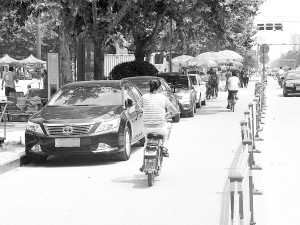 记者在市区走访发现,市区七一路、八一大道、中州大道、汉阳路、五一路等多条道路都有轿车乱停乱放的现象。究其原因,汉阳路一小区的居民王先生说:“原来小区规划的车位就少,现在小区内的居民很多都买了轿车。如果车辆都在家,小区内停不下,一般我们都把车停到小区大门前的慢车道上。”