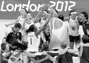 当地时间8月11日,在2012年伦敦奥运会女子排球决赛中,巴西队以3比1战胜美国队,夺得冠军。
