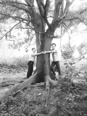 据了解,该皂角树已有上百年的历史,树高约四五米,树干需要两个人合抱才围得起来(如图)。远远望去,整棵树宛如一个巨大的盆景,非常壮观。