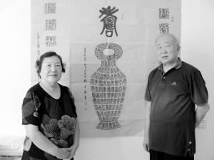 淮阳县七旬夫妇张卓恭和王玉琴共同创意,将1万个不同写法的寿字以古代篆书的形式组成100个宝瓶,创作了《百瓶万寿图》。图为其中一幅。见习记者 王凯 摄
