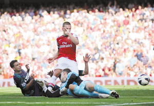 阿森纳今夏新引进的法国前锋吉鲁终场前8分钟,在距桑德兰大门8码处接队友卡佐拉传球,结果射门偏出,不像他上赛季效力蒙彼利埃那样不断破门得分。