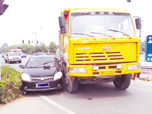 市交警支队事故民警接到报警后赶到事故现场,只见一辆黄色大货车把一辆小车逼到绿化带旁(如图)。据了解,由于中州大道南段正在修火车道,原有的道路分成4条小道,而且限高4米。由于该施工处右侧为大货车通道,左侧为小轿车通道。大货车正向通过时与小轿车发生侧撞。“这俩车谁也不让谁,才发生这样的事。”现场一位施工人员说。在事故民警的调解下,双方车主达成一致意见。