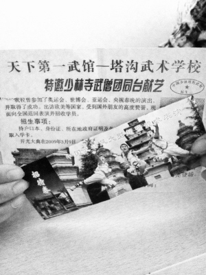 记者注意到,两个“少林武僧”发放的传单印制得非常粗糙,上面写着“天下第一武馆——塔沟武术学校特邀少林寺武僧团同台献艺”等字样,演出时间和演出地点都没有。同时他们还附赠了一张入场券,上面写着“中国武林风大型超强武术表演”和“本券注意保存,可到少林寺观光旅游”的字样。