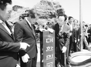 8月19日,韩国庆尚北道政府在独岛(日本称竹岛)东岛望洋台举行“守护独岛标志石”揭牌仪式,以向外界伸张主权。韩国行政安全部长官孟亨奎、庆尚北道道知事金宽容等人士出席了揭牌仪式。