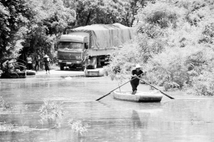 8月21日,在广西南宁市邕宁区蒲庙镇新新村,村民在被水淹没的马路上划船出行。