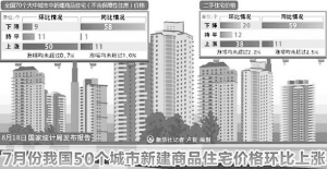 国家统计局8月18日发布的7月份70个大中城市住宅销售价格变动情况显示,与上月相比,70个大中城市中,新建商品住宅价格下降的城市有9个,持平的城市有11个,上涨的城市有50个。虽然环比价格上涨的城市中,涨幅均未超过0.7%,但环比价格上涨的城市数量大幅增加,比6月同期的数据翻了一番。业内人士认为,7月房价的变化延续着整个上半年的整体走势并不意外,房地产市场已经进入关键时期,下一阶段调控政策的走向将决定长期的市场发展方向。