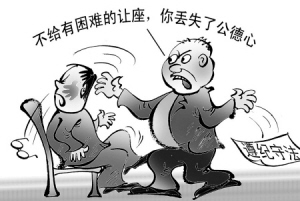 比如小伙子不让座,全车的人可以批评和声讨,现场进行道德审判,使之坐立不安,还可以拍成照片或视频经过技术处理后发到网上讨论,形成道德共识,集体谴责不道德的行为,使不道德的人受到应有的道德审判,促使其内心产生懊悔、自责,下决心改正,社会道德才会理性上升。