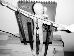家里的很多毛笔没有地方放,本想买个笔筒,但觉得用的时候还是不方便。看到柜子上的小木头人饰品,灵感就来了。将小木人的双手展开,系上绳子,毛笔用曲别针挂上去,就成了简易毛笔架了。