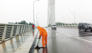 昨日上午,细雨绵绵,一位环卫工人在雨中打扫大庆路大桥上的垃圾,清理排水口周围淤积的杂物。他说:“这是我的工作,不论刮风下雨,我都要坚守在岗位上。”晚报记者 张志新 摄