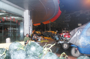 8月26日22时许,大雨,市行政服务中心大厅门口聚集了20多辆卖西瓜的农用车,大厅的屋檐下睡着数十个卖西瓜的农民。“每年这个季节,我们都会用车拉上自家种的西瓜到城里卖。”一位姓史的卖西瓜老人说,每当夜幕降临,他们就聚集在沿街楼房的屋檐下休息;天一亮,他们又各奔东西,散布到城市的每一个角落叫卖。坐在老人身边的一位老太太说:“眼下就盼着这雨早点停,天能赶快热起来。”