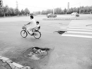 记者赶到现场看到,两个路坑位于该路口南侧,靠近路边的坑被人填进了泥土、石块,路中间的坑深约30厘米。