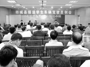 8月26日,郸城县教体局、交警大队在郸城县第二高级中学组织召开全县民办学校校车驾驶员安全例会。例会规定每月最后一个星期天为驾驶员安全例会日,任何学校不得无故缺席。该县召开例会,加大了监管督查力度,严查违章违规校车上路,真正把道路交通安全教育落到了实处。(张新 摄)