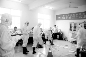 8月28日,郸城县疾控中心组织20多名疾控专业人员,进行了一次突发公共卫生事件应急处置能力演练(如图)。当日,记者现场看到,由于气罐内“毒气”泄漏,疾控工作人员迅速进行了事故技术处置,并利用与泄漏“毒气”相互中和的化学物品将安全隐患消除。