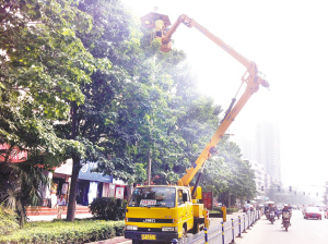 8月30日上午,在周口市区七一路,工作人员检修道路两侧路灯,以保为市民提供一个“明亮”的出行环境。