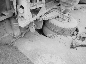 记者看到,货车后轮处的路面被压了个大坑,车轮陷在里面(小图)。