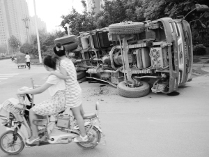 记者在现场看到,这辆拉砂的大货车侧翻在交叉口西北侧的路边(大图),两名男子蹲在路边的花坛旁,盯着散落在地上的砂子发呆。其中一人是货车司机,姓董。他告诉记者,17时许,他把货车停在马路边,忽然感到车身下沉,随后货车侧翻,他本人从车中爬出,没有受伤。